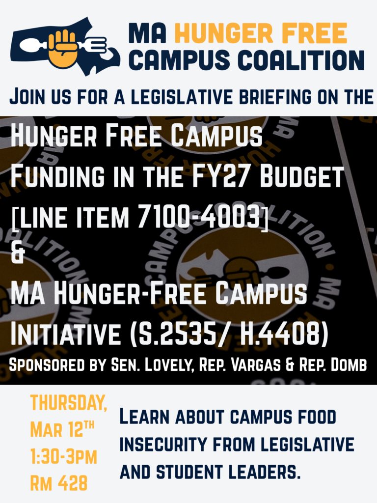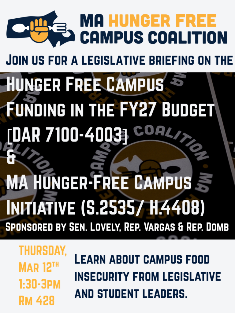 Join the coalition in advocating for the Hunger Free Campus Initiative on March 12 at the Massachusetts State House from 1-3pm. Register to join us here